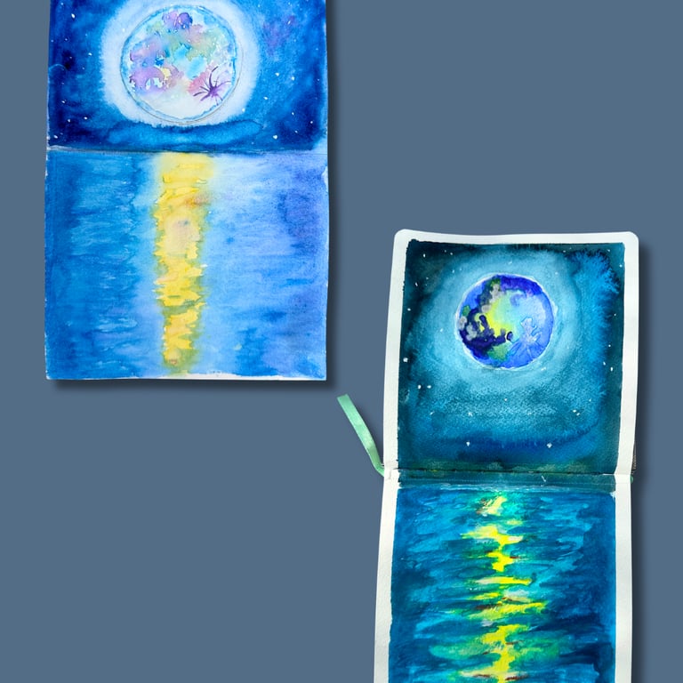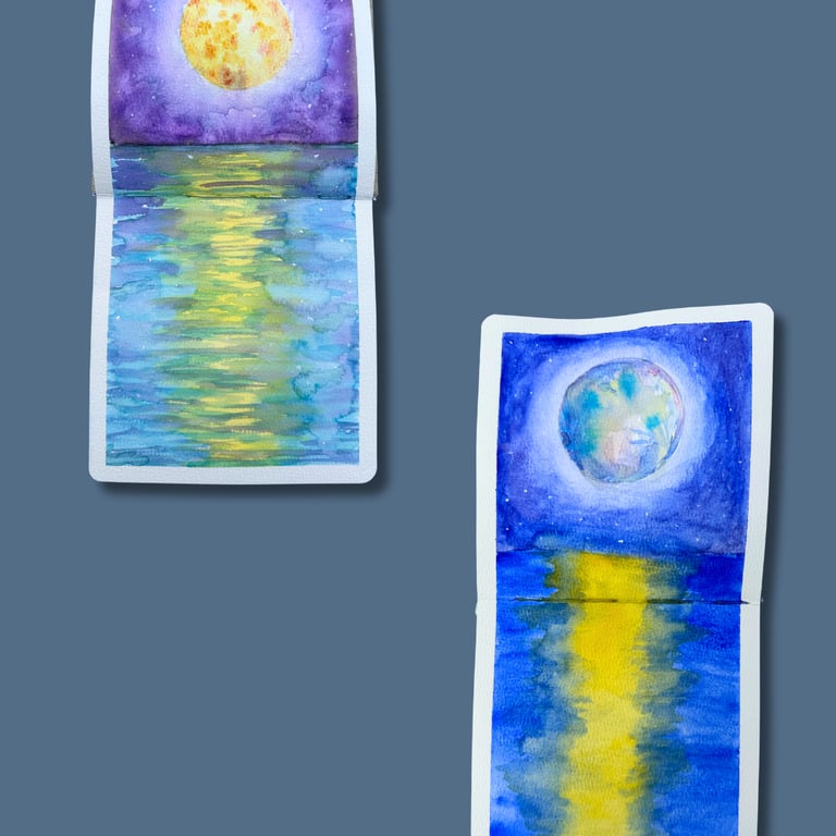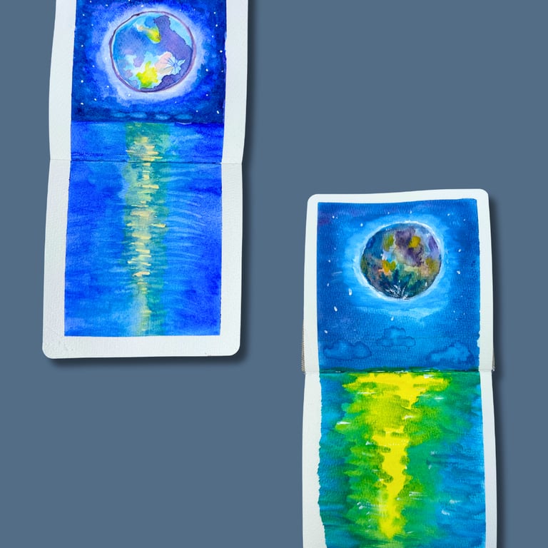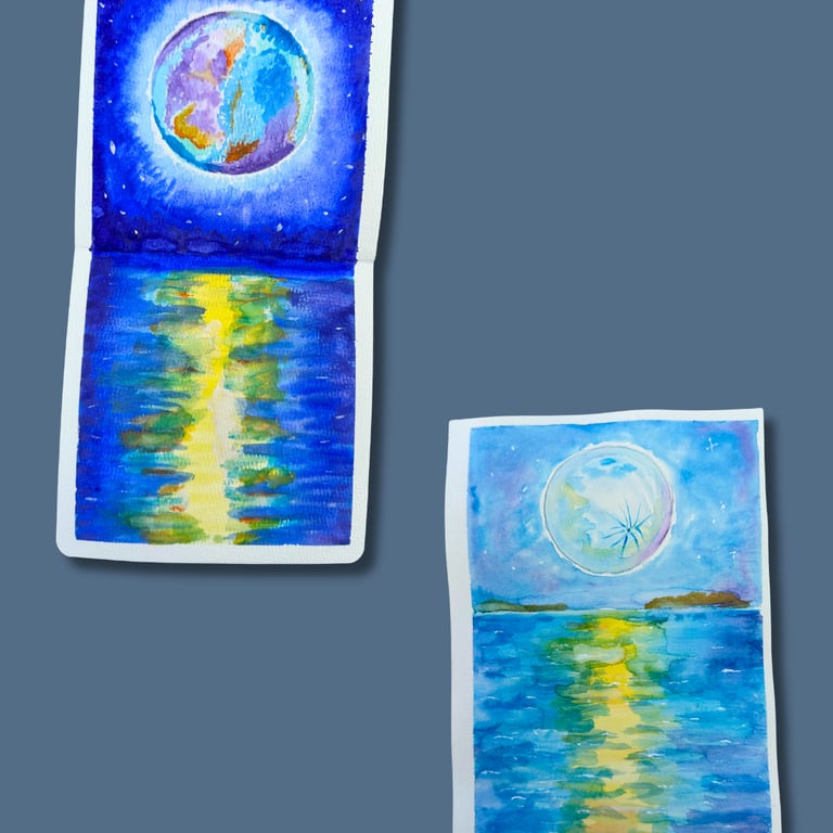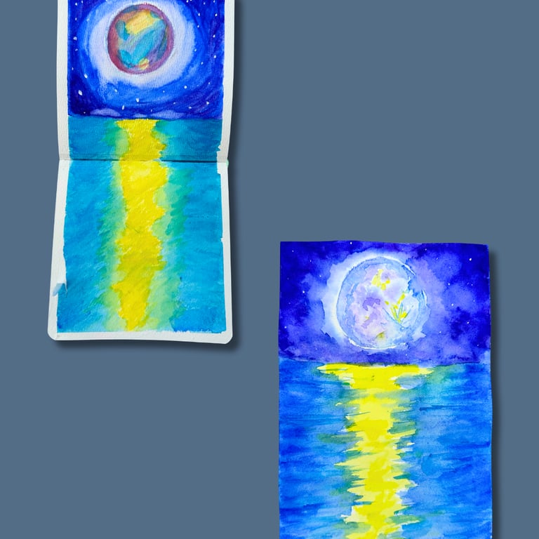 Nineteen students joined this class, and the room was filled with laughter, curiosity, and creativity. Everyone painted so beautifully, exploring watercolor techniques like wet-on-wet and dry-on-wet to capture the soft glow of the moon over the ocean.